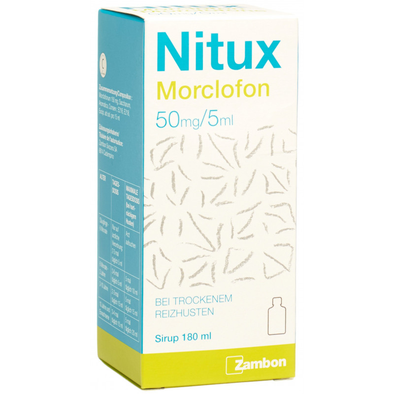 Information patient du Compendium Suisse des Médicaments® Nitux Zambon Switzerland Ltd Qu’est-ce que Nitux et quand doit-il être utilisé? Nitux sirop contient le principe actif morclofone. Il est indiqué pour le traitement de la toux sèche et irritative de diverses origines et est doté d'une action antitussive accompagnée d'une action relaxante sur la musculature bronchique. Nitux sirop n'appartient pas à la classe des antitussifs narcotiques (morphino-mimétiques). En général, il ne cause pas de somnolence, n'affecte pas la respiration et ne cause pas de constipation. Nitux peut être utilisé chez les nourrissons à partir de 6 mois et chez les enfants.